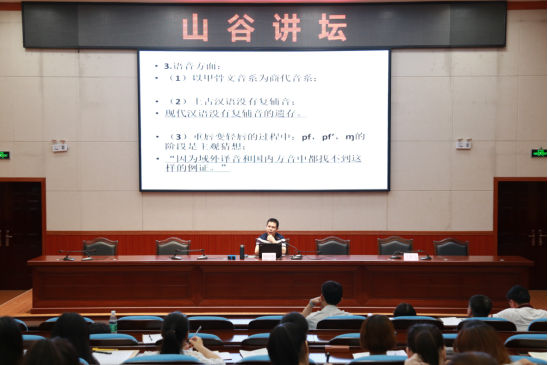 杨怀源还举例讲述了汉语史研究中的默证误用,例如,未找到比甲骨文更古老的文字就判定甲骨文为我国最古老的文字,在现代汉语中没有发现复辅音就强调现代汉语没有复辅音的遗存,这些都是默证的误用。为了论证对“王”的考释的看法,他引用了孔子、俞樾、徐中舒、胡厚宜、吴其昌等人对这个问题的相关论述。他还从赵元任先生对王力先生著成的毕业论文《中国古文法》的批语“言有易,言无难”来谈做汉语史研究的治学态度。杨怀源表示在分析默证问题时要注意系统性,注意历史比较法,要具体问题具体分析。他的讲解生动形象,深入浅出,让大家对汉语史研究中的默证问题有了深刻的认识。