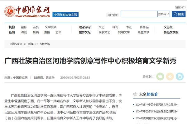 6月2日,中国作家网刊发了一篇题为《广西壮族自治区河池学院创意写作中心积极培育文学新秀》的文章,充分肯定了河池学院在落实培育文学新人工作取得的成绩。