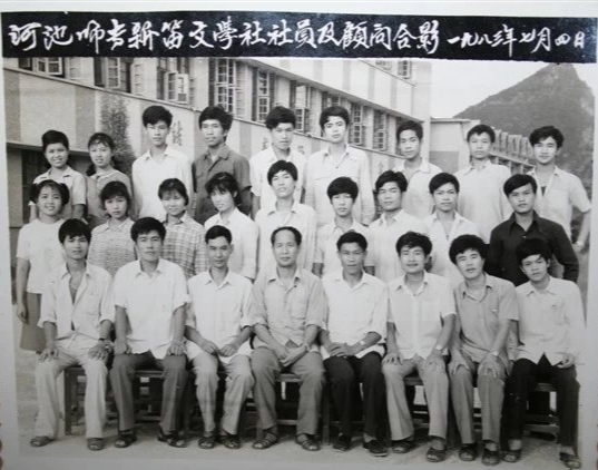 新笛文学社成立不久,学校又将校报(即《河池师专》报)交给我们办,由我任主编,梁颍武任副主编。我们还在全校范围开展征文比赛,并对获奖作品进行张榜公示,引起同学们的强烈反响。田代琳(那时他还没有笔名)的小说《校徽和我们》就是在征文中引起我们的关注,刊发在副刊头条,他也因此成为新笛文学社成员。那个年代,我们最热心的当然是文学创作,在李果河老师的精心指导、推荐下,文学社很快就有五位同学的作品,发表在公开刊物《金城》上。这其中自然有凡一平和我的作品。凡一平发表的是小说《岁末》,是他在公开刊物发表的第一篇小说。我发的则是诗歌《致北山》,是我第一次在公开刊物发表的作品。我们五个同学得了稿费后,每人拿出五元钱,买了酒肉去李果河老师家庆贺,全部喝得烂醉。