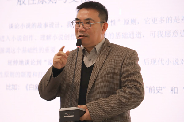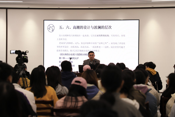 讲课之初,李浩提出了自己关于文学写作的观点:文学是“设计”出来的。“我是一个匠人,我懂得设计。”他表示,这虽为一家之言,却有其规则、规律与某种准确性。随后李浩就着“小说的结构设计与细节设计”的主题向在座师生分享了关于小说设计的特性、规律及原则。讲课期间,李浩以许多著名文学作品为例,如《安娜·卡列尼娜》中结尾主人公走向铁轨的设计、《红楼梦》中不同人物走向的设计、《老人与海》中结局的设计等,向大家阐述了小说设计的重要性。