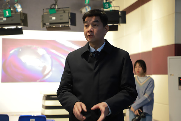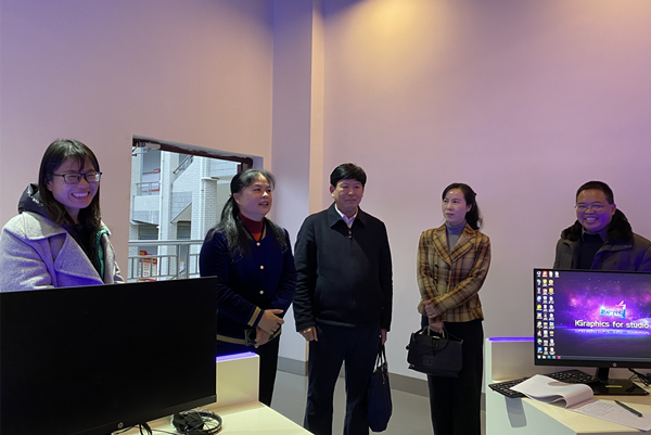 队伍先到达了桂西北舆情监测与分析研究中心,孔献玲部长视察了环境,对我校的设备建设表示赞赏,同时提出应搭建好学生实践平台,给学生提供更多的锻炼机会。在全媒体教学实训中心里,孔献玲部长提出应增设新闻主持专业,培养新闻事业人才,为新闻事业助力,润物细无声地报道好中国故事。随后在新闻演播厅中,孔献玲部长还提出了大一是理论的学习时期,大二的学生可以开始进行实践活动,走进基层,将理论知识与专业知识相结合,同时并提出了要重视好河池新闻这座富矿。