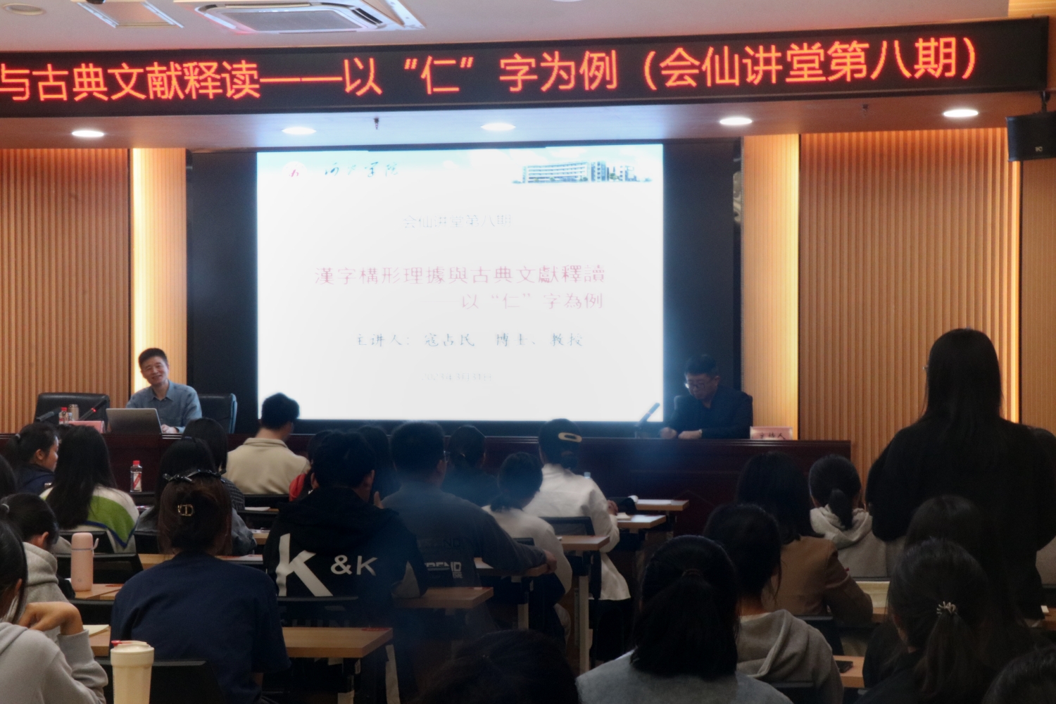 3月31日,167net必赢入口会仙讲堂第八期学术讲座在格致楼102教室进行,此次讲座的主题是《汉字构形理据与古典文献释读——以“仁”字为例》。主讲人为河池学院167net必赢入口教授、博士寇占民。本次讲座由申宾博士主持,汉语言文学专业的学生聆听本次讲座。