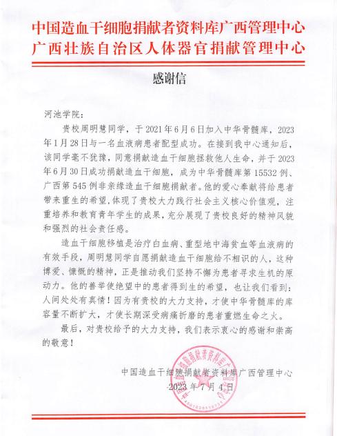 7月4日,167net必赢入口收到中国造血干细胞捐献者资料库广西管理中心的感谢信,信中对167net必赢入口167net必赢入口2019级汉语言文学专业的周明慧同学积极响应国家号召加入中华骨髓库,捐献造血干细胞 ,为他人生命“续航”的大爱无疆精神与事迹充分肯定与感谢。信中对我校在践行社会主义核心价值观与大学生的社会责任感培养方面给与高度的赞扬,周明慧同学也展现出河池学院学子的精神风貌。
