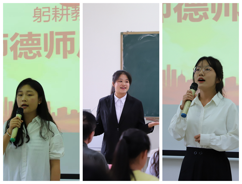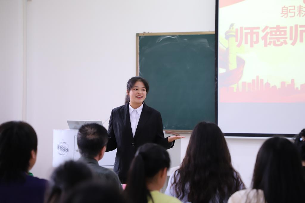 活动上,各位选手结合实际生活和学习经历,紧密围绕着“躬耕教坛,强国有我”的主题,精神饱满,感情充沛,用流畅的语言讲述着对教师职业的理解和憧憬。经过两个多小时的激烈角逐,廖菲菲和陈艳两位同学以昂扬的精神状态,独特的视角、真情实感脱颖而出,荣获一等奖。
