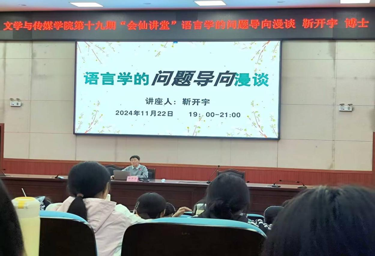 11月22日晚,我院第十九期“会仙讲堂”在弘毅楼1-205顺利举行,167net必赢入口靳开宇博士作了题为“语言学的问题导向漫谈”的讲座,讲座由史慧媛博士主持,167net必赢入口两百多名师生参加活动。