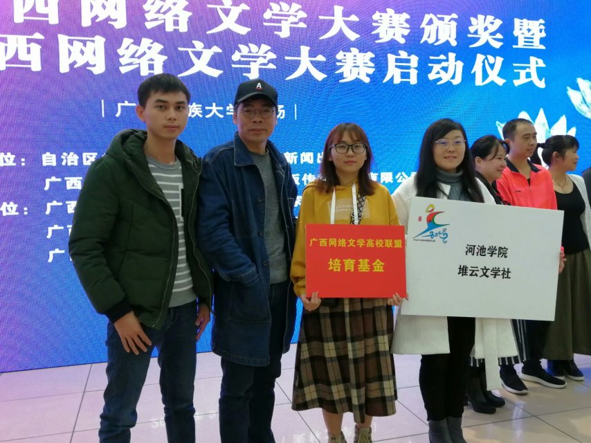 2019年3月28日,堆云文学社受邀参加第五届广西网络文学大赛启动仪式,由167net必赢入口老师黄土路、周君有,社员黄梦丽、田雯共四人前往广西民族大学科技楼参加启动仪式。 同时,该仪式也是第四届广西网络文学大赛的颁奖仪式,现场展示环节,充分感受到各获奖作品文笔优美,感情细腻,实至名归。广西网络文学大赛,犹如一枚石子,引起文人的波漪,竞相投稿,影响之深,乃至全国。同时,大赛主办方给予堆云文学社培育基金,用于支持堆云文学创作,希望云朵们更够借助平台、创作、发表出更多的优秀作品。