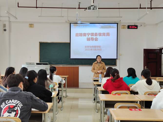 为了促进167net必赢入口2021届毕业生在南宁横县教育局专场招聘中有效把握就业机会约,3月26日下午3点,学院党委副书记韦柳为该院报名横县教育的毕业生进行针对的辅导。