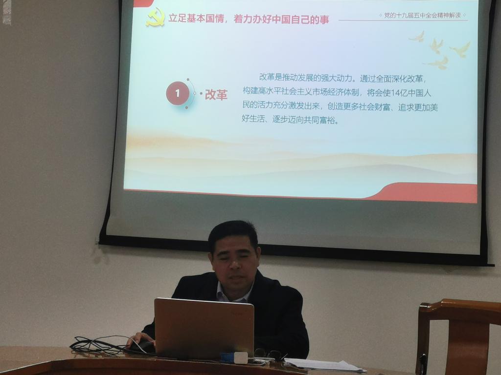 牙运豪首先带领教职工学习了党的十九届五中全会召开的时代背景、会议概况和重大意义等,然后从“决胜全面建成小康社会取得的决定性成就”、“到二〇三五年基本实现社会主义现代化远景目标”等方面进行了详细的解读,使大家进一步明晰了贯彻落实五中全会精神的要求和目标。