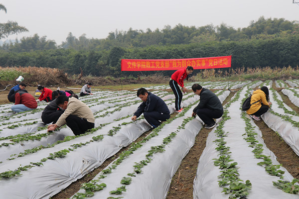 为扎实推进党史主题教育工作,不断增强党员服务意识。12月11日,文传学院教工党支部党员牺牲休息时间前往庆远镇龙村地辽屯为刘三姐镇乍洞村村集体经济“乡村草莓园”盖地膜,除草。党员们充分发挥不怕苦不怕累的精神,分工明确、配合默契,辛勤劳作,田间地头呈现出一派繁忙的劳动景象。