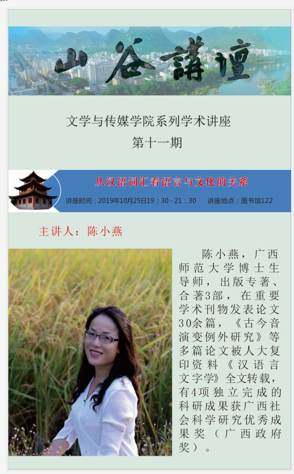 陈小燕,广西师范大学博士生导师,出版专著、合著3部,在重要学术刊物发表论文30余篇,《古今音演变例外研究》等多篇论文被人大复印资料《汉语言文字学》全文转载,有4项独立完成的科研成果获广西社会科学研究优秀成果奖(广西政府奖)。