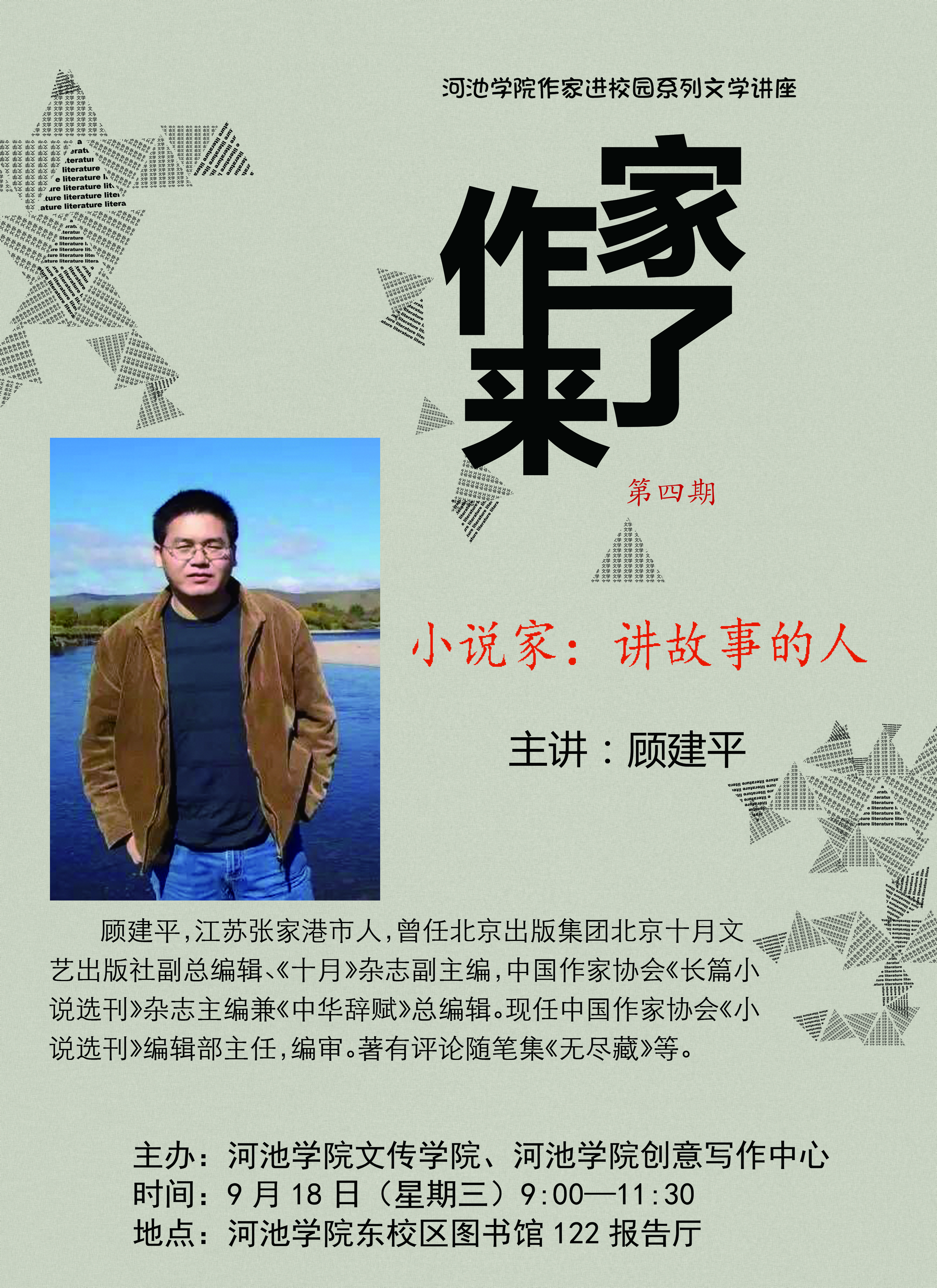顾建平,江苏张家港市人,1968年出生,1984-1991年就读于北京大学中文系,文学硕士。1986年开始发表文学作品,2000年加入中国作家协会,著有评论随笔集《无尽藏》等。曾任北京出版集团北京十月文艺出版社副总编辑、《十月》杂志副主编,中国作家协会《长篇小说选刊》杂志主编兼《中华辞赋》总编辑。现任中国作家协会《小说选刊》编辑部主任,编审。