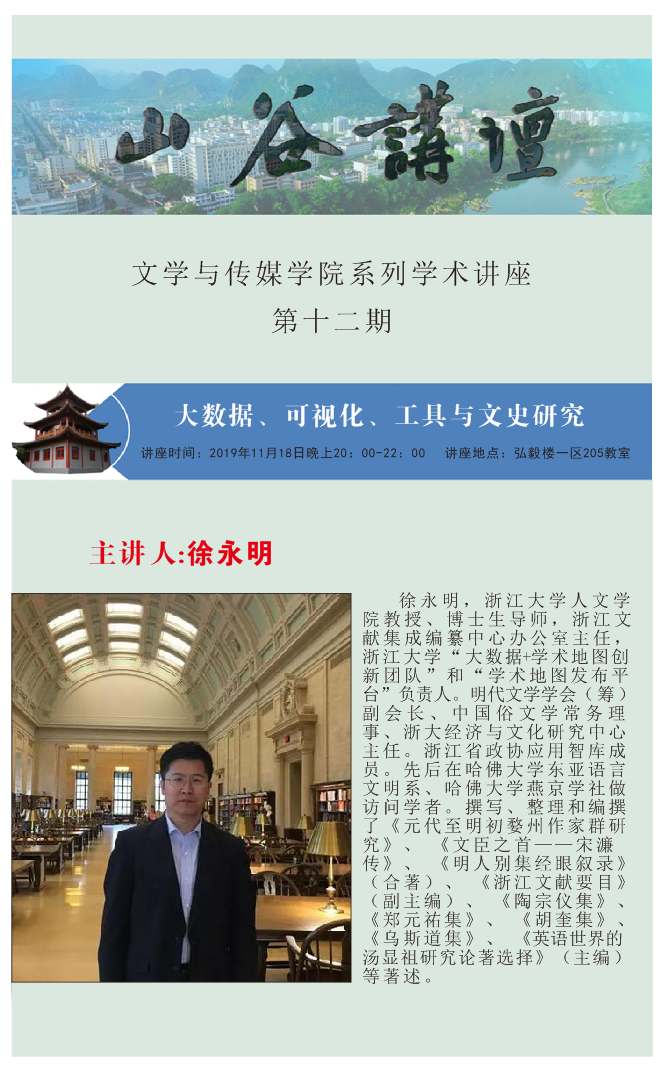 徐永明,浙江大学人文学院教授、博士生导师,浙江文献集成编纂中心办公室主任,浙江大学“大数据+学术地图创新团队”和“学术地图发布平台”负责人。明代文学学会(筹)副会长、中国俗文学常务理事、浙大经济与文化研究中心主任。浙江省政协应用智库成员。先后在哈佛大学东亚语言文明系、哈佛大学燕京学社做访问学者。撰写、整理和编撰了《元代至明初婺州作家群研究》、《文臣之首一一宋濂传》、《明人别集经眼叙录》(合著)、《浙江文献要目》(副主编)、《陶宗仪集》、《郑元祐集》、《胡奎集》、《乌斯道集》、《英语世界的汤显祖研究论著选择》(主编 )等著述。
