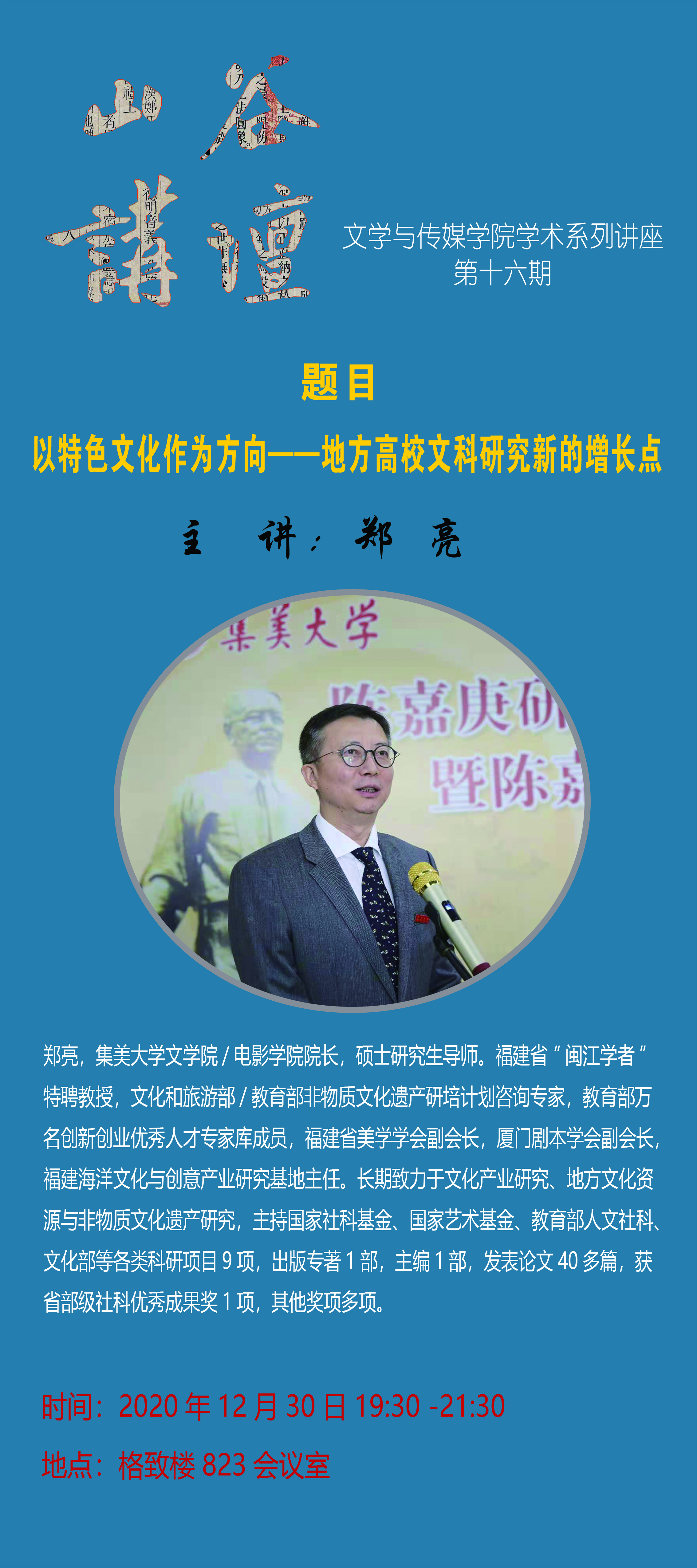 郑亮,集美大学文学院/电影学院院长,硕士研究生导师。福建省“闽江学者”特聘教授,文化和旅游部/教育部非物质文化遗产研培计划咨询专家,教育部万名创新创业优秀人才专家库成员,福建省美学学会副会长,厦门剧本学会副会长,福建海洋文化与创意产业研究基地主任。长期致力于文化产业研究、地方文化资源与非物质文化遗产研究,主持国家社科基金、国家艺术基金、教育部人文社科、文化部等各类科研项目9项,出版专著1部,主编1部,发表论文40多篇,获省部级社科优秀成果奖1项,其他奖项多项。