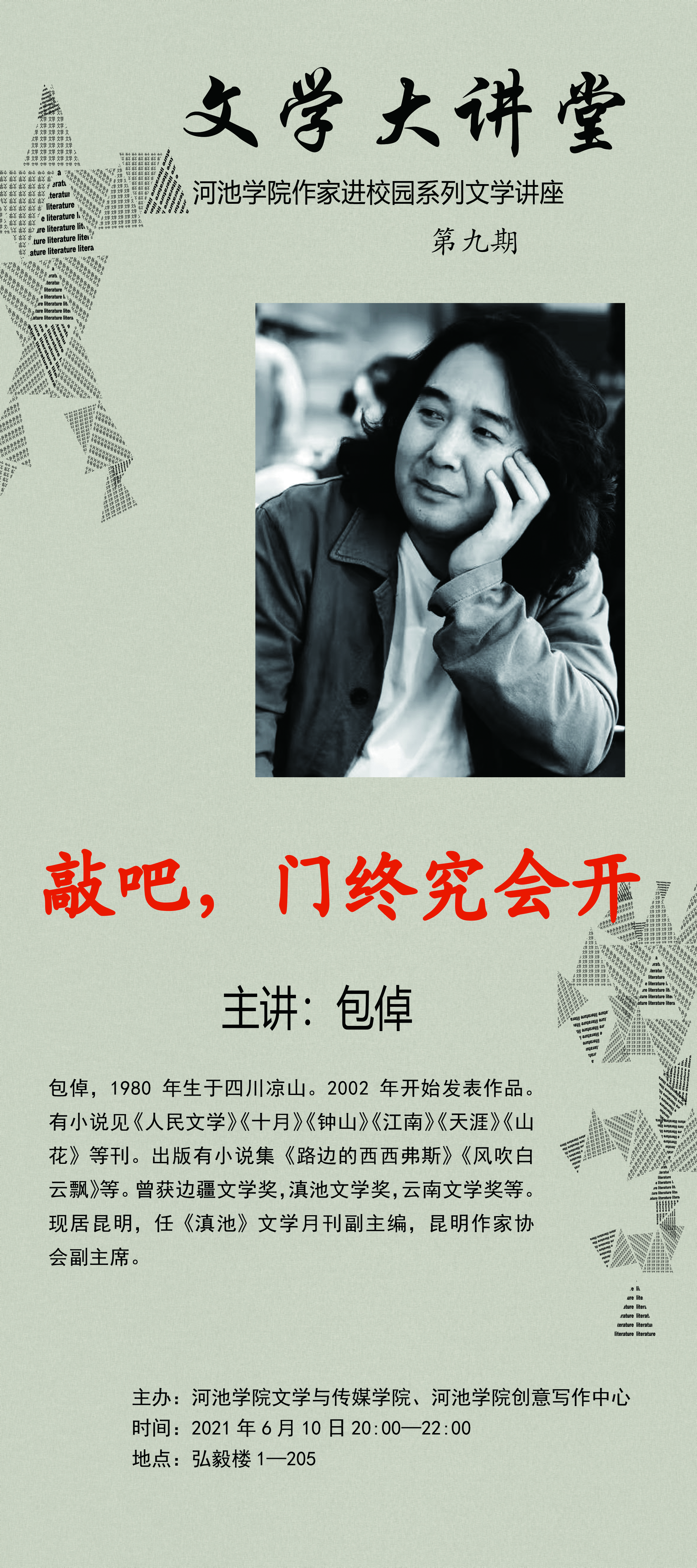包倬,1980年生于四川凉山。2002年开始发表作品。有小说见《人民文学》《十月》《钟山》《江南》《天涯》《山花》等刊。出版有小说集《路边的西西弗斯》《风吹白云飘》等。曾获边疆文学奖,滇池文学奖,云南文学奖等。现居昆明,任《滇池》文学月刊副主编,昆明作家协会副主席。