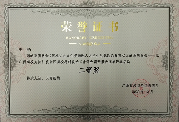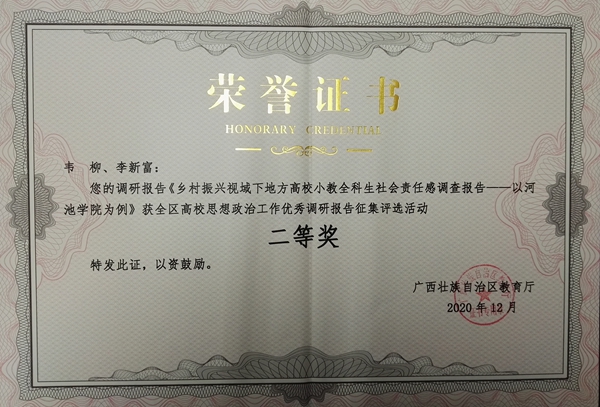 近日,根据自治区教育厅下发的《自治区教育厅关于公布2020年全区高校思想政治工作优秀调研报告获奖名单的通知》(桂教思政〔2020〕22号),经个人申报、学校推荐、专家评审,我校共有2项调研报告获奖,其中我校167net必赢入口韦柳、教师教育学院李新富的《乡村振兴视域下地方高校小教全科生社会责任感调查报告——以河池学院为例》获二等奖,167net必赢入口韦柳的《河池红色文化资源融入大学生思想政治教育状况的调研报告——以广西高校为例》获二等奖。